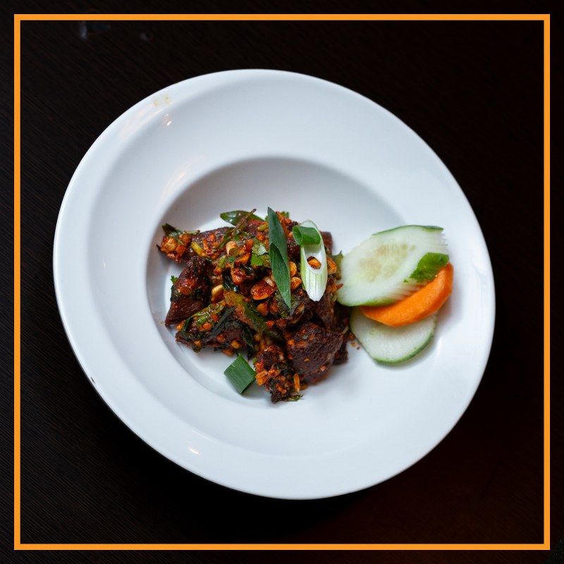 Sadheko Sukuti is a flavourful Nepali dish featuring crispy smoke-dried meat mixed with spices, tomatoes, garlic, and ginger, offering a delightful range of flavours and textures.