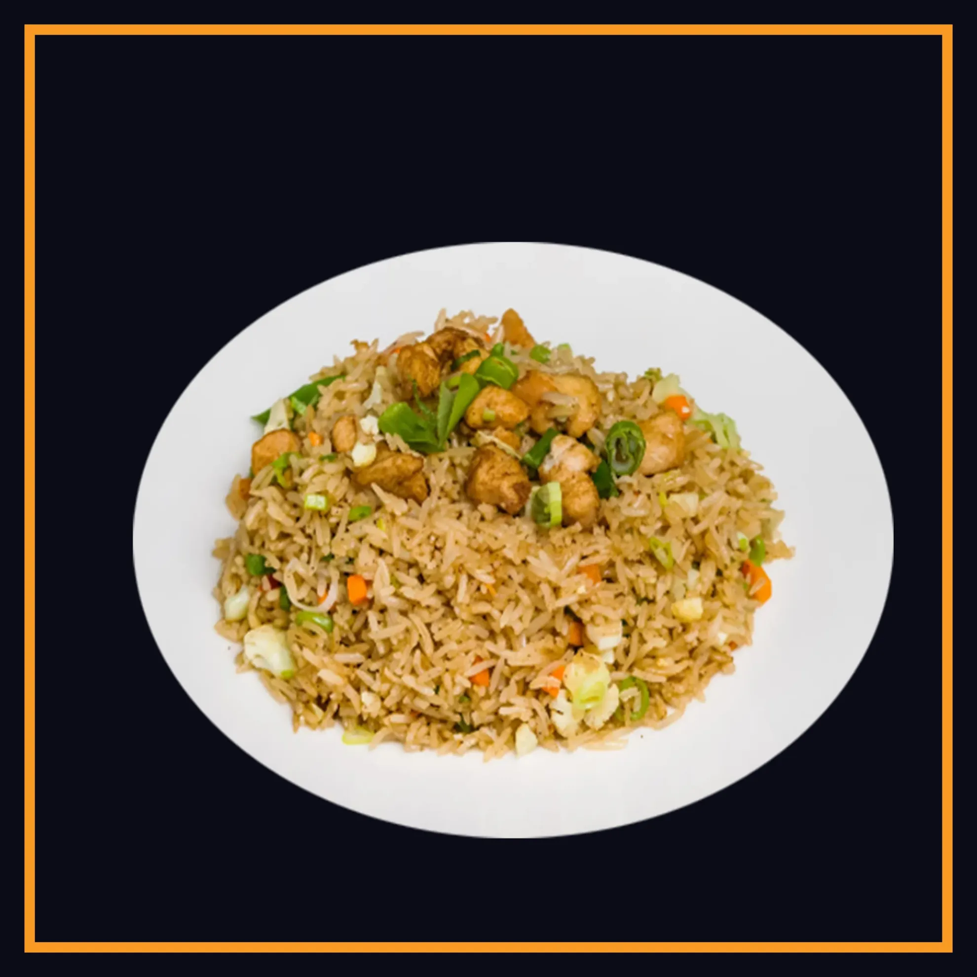 It features a crispy crust topped with tangy tomato sauce, shredded mozzarella cheese, seasoned chicken, and optional toppings like onions, bell peppers, and mushrooms.