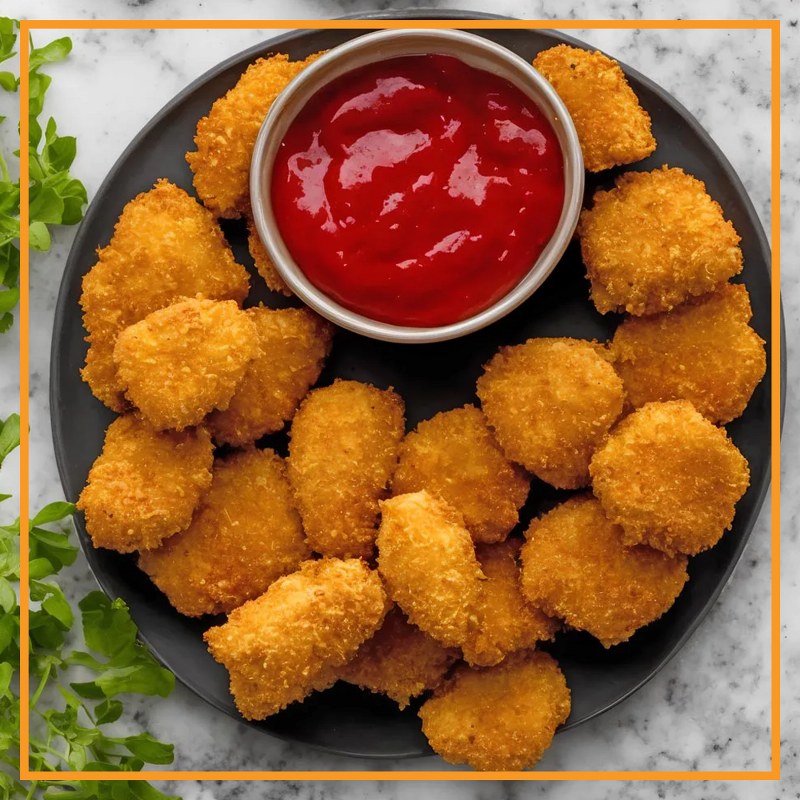 Bite-sized pieces of chicken meat coated in breadcrumbs or batter, deep-fried until golden and crispy.