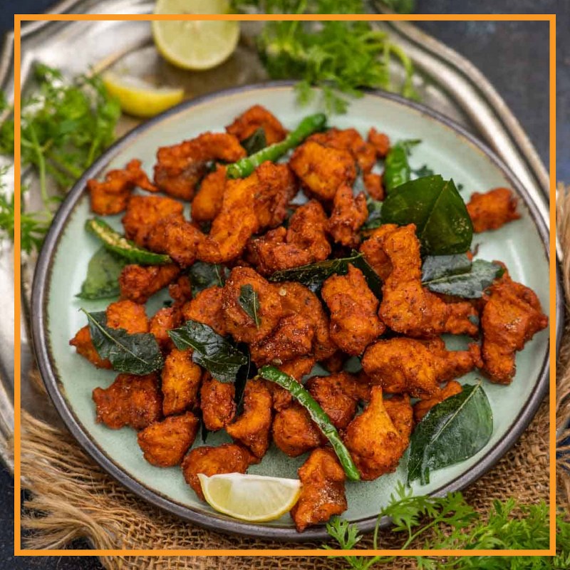 Cubes of chicken coated in a spiced chickpea flour batter, deep-fried until golden and crispy.
