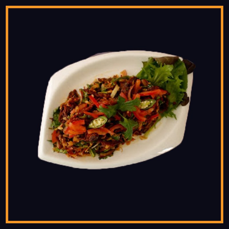 Sukuti Sadheko is a uniquely Nepali dish featuring crispy smoke-dried meat mixed with aromatic spices, fresh tomatoes, zesty garlic, and invigorating ginger, offering a delightful range of flavors and textures.