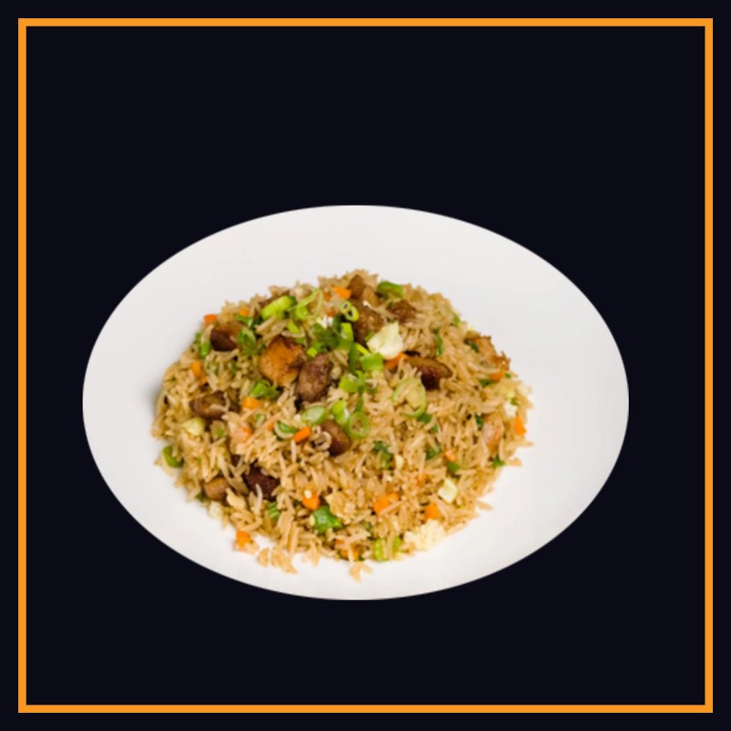Dish made with cooked rice stir-fried with diced pork meat, vegetables like carrots, peas, onions, eggs, and soy sauce.
